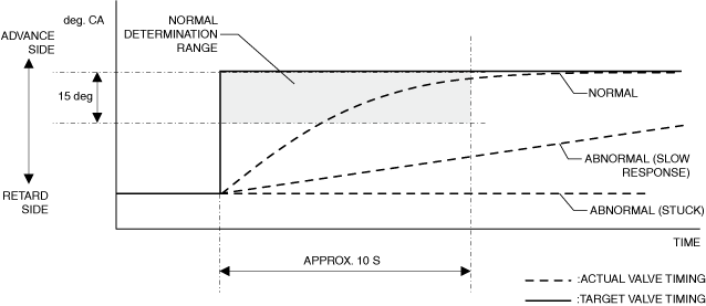• With the preconditions met, the PCM verifies the conformity of the actual timing relative to the target valve timing. If it does not conform to the normal determination range (difference between target valve timing and actual valve timing is 15 degrees or less) during the malfunction determination period ( approx. 10 s), even if the target valve timing is set to the advance side, the PCM determines an excess retard malfunction condition and stores a DTC.