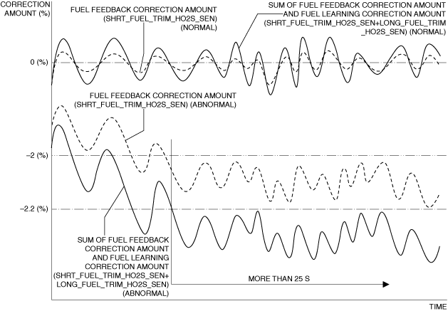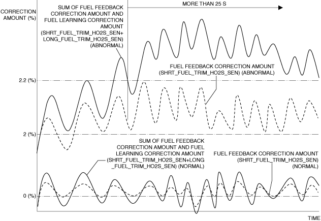 • P2096:00: Depending on the correction deviation of the A/F sensor, a condition in which the fuel feedback correction amount (SHRT_FUEL_TRIM_HO2S_SEN) for the HO2S is the specified value ( 2 %) or more and the sum (SHRT_FUEL_TRIM_HO2S_SEN+LONG_FUEL_TRIM_HO2S_SEN) of the fuel feedback correction amount and the fuel learning correction amount is the specified value ( 2.2 %) or more continues for a period of 25 s.