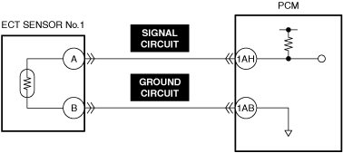 • The PCM monitors the ECT sensor No.1 signal. If the PCM detects that the ECT sensor No.1 voltage at the PCM terminal 1AH is below 0.23 V for 5 s, the PCM determines that the ECT sensor No.1 circuit has a malfunction.