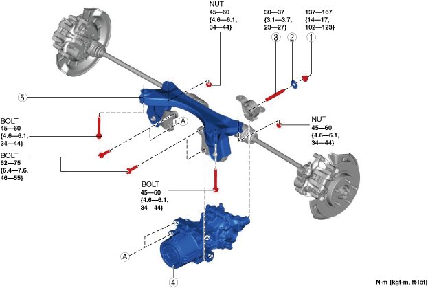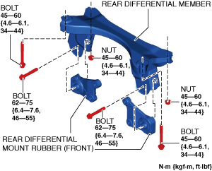 • Always verify that the rear differential component is securely supported by a jack. If the rear differential component falls off, it can cause serious injury or death, and damage to the vehicle.