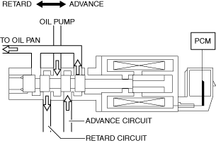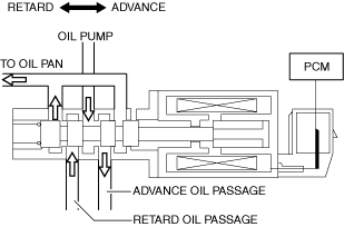 • The spool valve is moved to the retard side by the signal from the PCM and engine oil is lead to the retard oil passage of the exhaust camshaft.