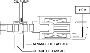 • The spool valve is moved to the advance side by the signal from the PCM and engine oil is lead to the advance oil passage of the exhaust camshaft.