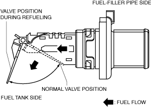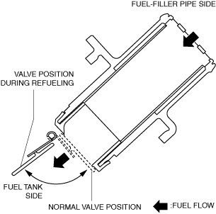 • Normally, the valve is closed as shown by the dotted line in the figure. When refueling, it opens as shown by the solid line due to the force caused by the flow of fuel. When refueling is finished, the valve returns to the normal valve position by spring force.