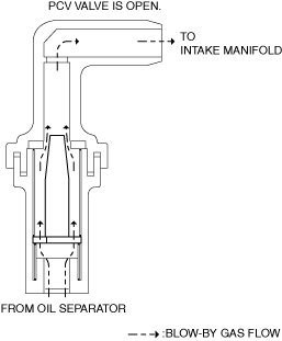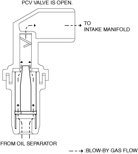 • When the valve is pulled by the intake manifold vacuum, blow-by gas flows to the intake manifold.