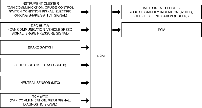• The cruise control system performs engine control via the PCM to maintain the set vehicle speed based on the target acceleration speed signal from the BCM.• The relations between each component part and functions are as follows.