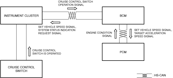 1.When the cruise control switch is operated, the BCM recognizes the set vehicle speed that was set by the driver based on the cruise control switch operation signal sent from the instrument cluster.
