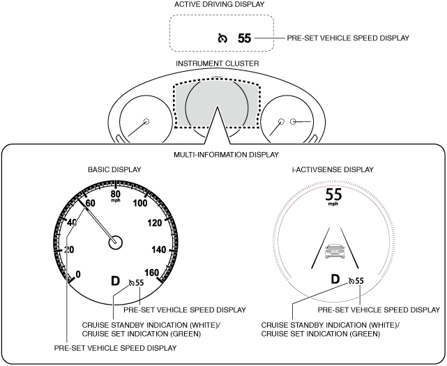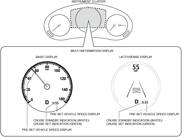 • The cruise standby indication (white) is displayed on the multi-information display in the instrument cluster while the cruise control system is on standby to inform the driver that the cruise control system is on standby.