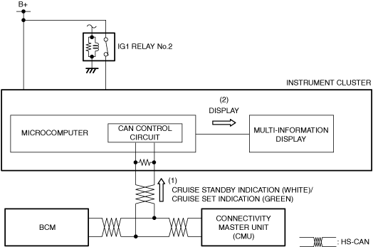 1.The instrument cluster receives (1) a cruise standby indication (white) illumination request signal or cruise control indication (green) illumination request signal from the BCM via CAN communication.