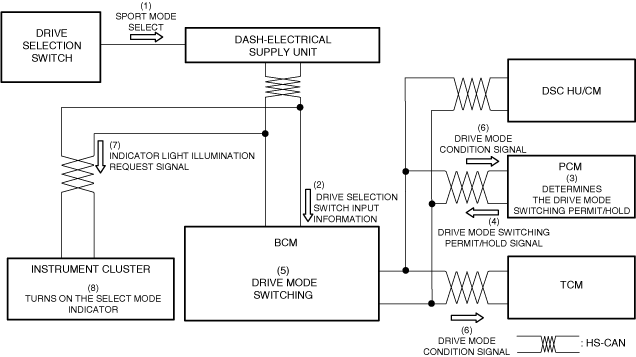 • If the drive selection switch is operated with a drive selection switching inhibition condition met, the PCM sends a select mode indicator light flash request signal to the instrument cluster.• The instrument cluster flashes the select mode indication to notify the driver that drive selection is currently inhibited.
