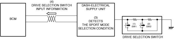 2.The Dash-Electrical Supply Unit detects (3) the sport mode selection condition based on the open/close of contact points SW1 and SW2 of the drive selection switch.