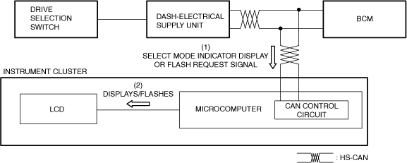 1.The instrument cluster receives (1) a select mode indicator display or flash request signal from the BCM via CAN communication.