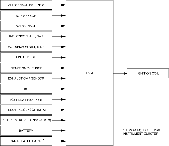 • If immobilizer system related information (engine start prohibited) is received from the BCM, the PCM stops ignition.• When a collision signal is received from the SAS control module, the PCM stops the ignition.