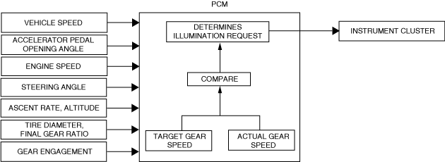 • The PCM compares the target gear speed (calculated from each signal) and the actual gear speed to determine a gear shift indicator illumination request.
