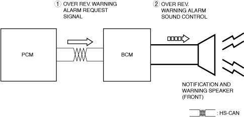 1. When the BCM receives (1) a over rev. warning alarm signal via CAN communication from the Instrument cluster, the BCM sounds the notification and warning speaker (2).