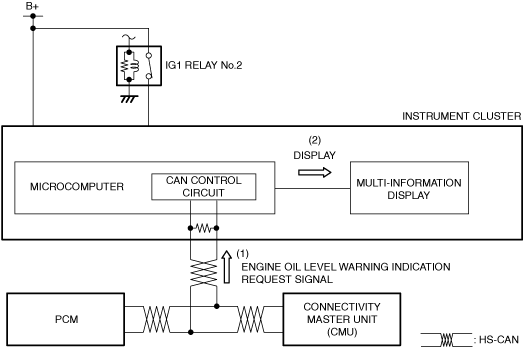 1. When the ignition is switched ON (engine off or on), the instrument cluster receives (1) an engine oil level warning indication request signal from the PCM via CAN communication.2. The instrument cluster displays (2) the engine oil level warning indication in the multi-information display.