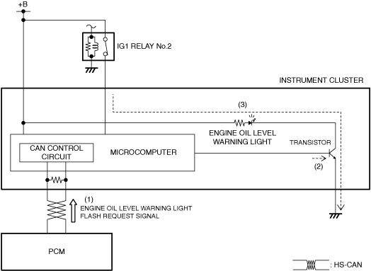 1. When the ignition is switched ON (engine off or on), the instrument cluster receives (1) an engine oil level warning light illumination request signal from the PCM via CAN communication.2. The instrument cluster turns the transistor on (2) based on the engine oil level warning light illumination request signal.3. When the transistor turns on, a ground circuit with the engine oil level warning light is established and the engine oil level warning light turns on (3).