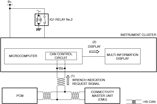 1. When the ignition is switched ON (engine off or on), the instrument cluster receives (1) a wrench indication request signal from the PCM or the CMU via CAN communication.2. The instrument cluster displays (2) the wrench indication in the multi-information display.