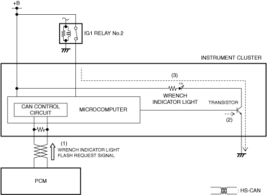 1. When the ignition is switched ON (engine off or on), the instrument cluster receives (1) a wrench indicator light illumination request signal from the PCM or the CMU via CAN communication.2. The instrument cluster turns the transistor on (2) based on the wrench indicator light illumination request signal.3. When the transistor turns on, a ground circuit with the wrench indicator light is established and the wrench indicator light turns on (3).