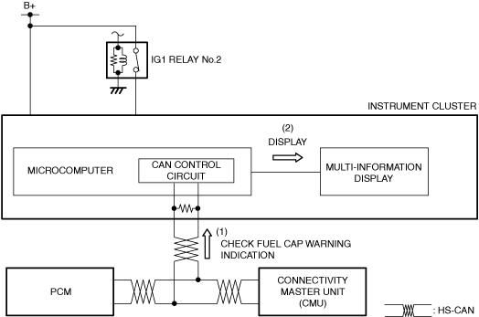1. When the ignition is switched ON (engine off or on), the instrument cluster receives (1) a check fuel cap warning indication request signal from the PCM or the CMU via CAN communication.2. The instrument cluster displays (2) the check fuel cap warning indication in the multi-information display.