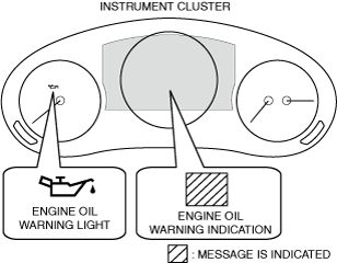 • The engine oil warning indication/engine oil warning light is equipped in the instrument cluster.• A warning message is displayed in the multi-information display as the same time the engine oil warning indication is displayed. For the message content and verification method, refer to [MULTI-INFORMATION DISPLAY]. (See MULTI-INFORMATION DISPLAY.)• A warning message in the center display is displayed when the engine oil warning indication/engine oil warning light is illuminated. For the message content and verification method, refer to the [CENTER DISPLAY] in the workshop manual.