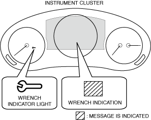 • The wrench indication/wrench indicator light is built into the instrument cluster.• A warning message is displayed in the multi-information display as the same time the wrench indicator light is turned on/wrench indication is displayed. For the message content and verification method, refer to [MULTI-INFORMATION DISPLAY]. (See MULTI-INFORMATION DISPLAY.)• A warning message is displayed in the center display as the same time the wrench indicator light is turned on/wrench indication is displayed. For the message content and verification method, refer to [CENTER DISPLAY] in the workshop manual.