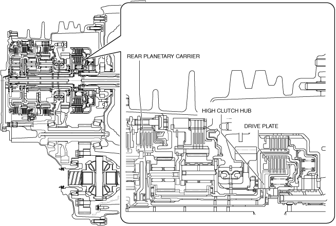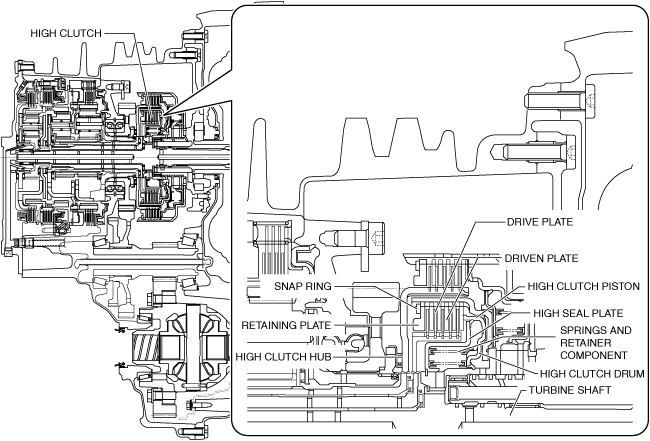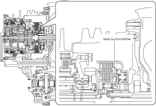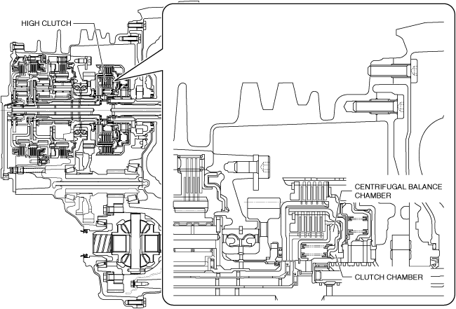 • The centrifugal balance clutch is built into the high clutch.• The centrifugal balance chamber is positioned opposing the clutch chamber for the high clutch. In the centrifugal balance chamber, ATF is constantly charged through a specialized hydraulic circuit.