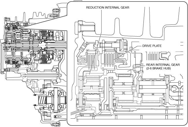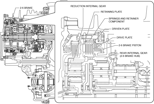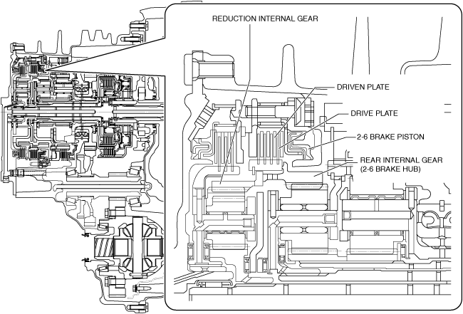 • The drive plate of the 2-6 brake is engaged with the 2-6 brake hub and rear internal gear, and the 2-6 brake hub is splined to the reduction internal gear. Therefore, the rear internal gear and reduction internal gear are locked by the 2-6 brake.
