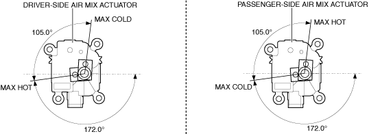 • A potentiometer-type air mix actuator has been adopted.• The driver-side air mix actuator is located on the driver’s side of the A/C unit.• The passenger-side air mix actuator is located on the passenger’s side of the A/C unit.• The operation range of the air mix actuator is as indicated in the diagram.