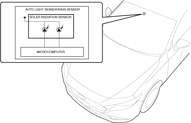 • If there is a malfunction in the solar radiation sensor, it outputs an error signal to the body control module (BCM).• The body control module (BCM) outputs a DTC based on an error signal from the solar radiation sensor.• For details on DTCs, refer to the [ON-BOARD DIAGNOSTIC SYSTEM [BODY CONTROL MODULE (BCM)]].