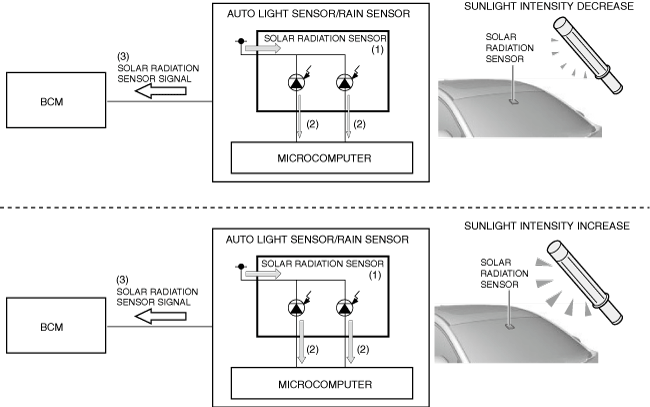 2.The microcomputer detects (2) the current from the solar radiation sensor and outputs (3) a solar radiation sensor signal to the body control module (BCM).