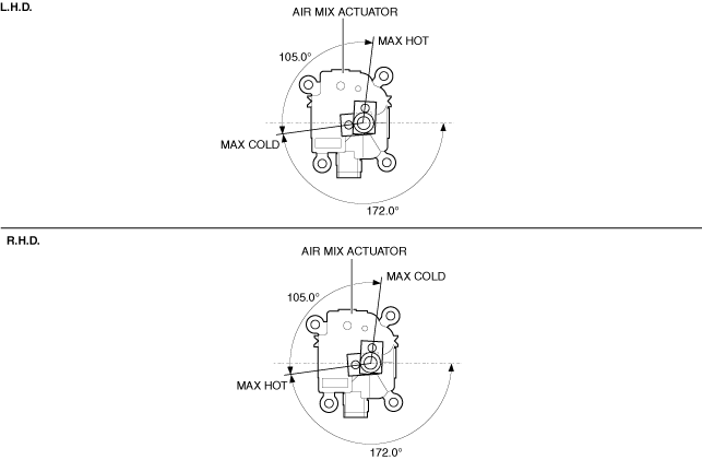 • A potentiometer-type air mix actuator has been adopted.• The air mix actuator is located on the passenger’s side of the A/C unit.• The operation range of the air mix actuator is as indicated in the diagram.