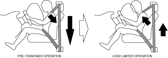 • When a certain amount of force is applied to the seat belt by an occupant moving forward by inertia force after the pre-tensioner seat belt operates, the locking base in the retractor is unlocked, the seat belt pulls out to mediate the pressure of the seat belt against the occupant.