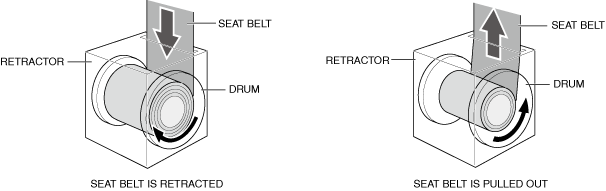• If a sudden force is applied to a seat belt by an occupant moving forward by inertia force due to a vehicle collision or sudden braking, the locking base in the retractor is locked to prevent the seat belt from being pulled out.
