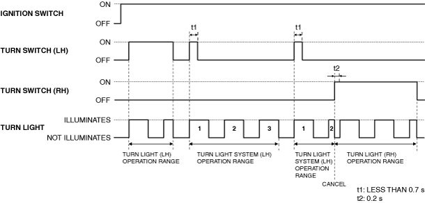 6. When the body control module (BCM) receives a turn switch signal for the opposite side while the turn light (LH) or (RH) is flashing 3 times automatically, it cancels the current automatic flashing. However, if the body control module (BCM) receives the turn switch signal for the opposite side for 0.2 s or more, it flashes the turn light while the turn light signal is being received.