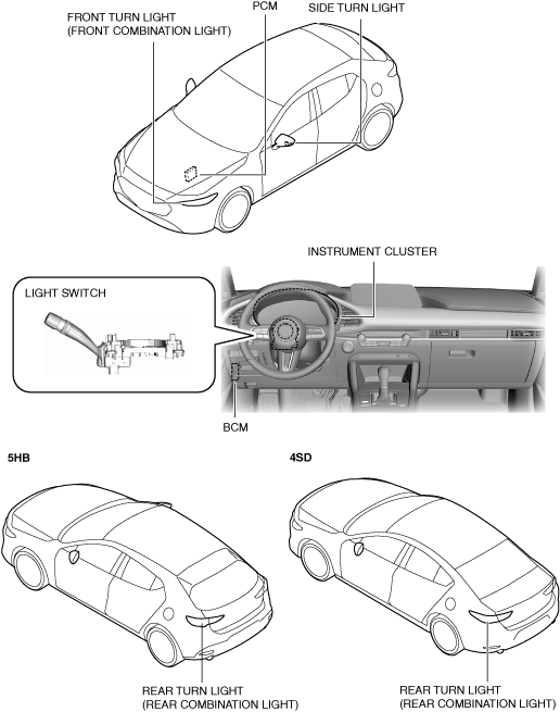 • The BCM performs control as follows based on the turn switch LH or RH signal sent from the instrument cluster via the CAN communication.