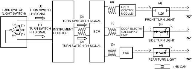1. When the turn switch is in the LH or RH position, the instrument cluster detects (1) a turn switch LH signal or turn switch RH signal.