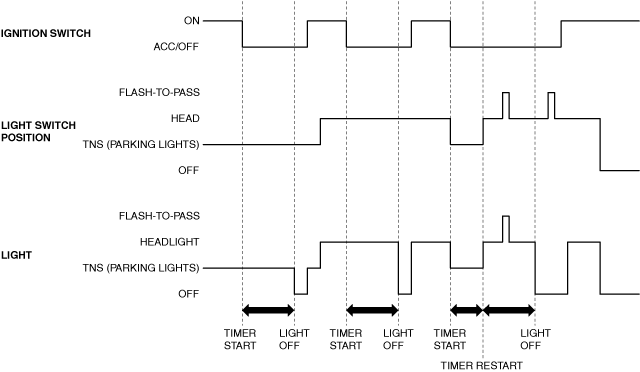 1.When the BCM receives a TNS (parking lights) or headlight signal from the instrument cluster with the ignition switched ACC or off, the TNS (parking lights) or headlights are turned on and counting of the illumination time begins.