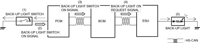 1. When the shift lever is in the reverse position, the back-up light switch turns on (1).2. When the back-up light switch turns on, the PCM detects (2) a back-up light switch on signal.3. The PCM sends (3) the back-up light switch on signal to the body control module (BCM) via CAN communication.4. When the body control module (BCM) receives the back-up light switch on signal, it sends (4) a back-up light on request signal to the electrical supply unit (ESU).5. When the electrical supply unit (ESU) receives the back-up light on request signal, it turns the back-up lights on (5).