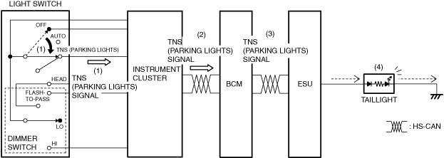 1.When the light switch is in the TNS (parking lights) position with the ignition switched ON (engine off or on), the instrument cluster detects (1) a TNS (parking lights) signal.