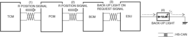 1. When the selector lever is in the R position with the ignition switched ON (engine off or on), the TCM sends (1) an R position signal to the PCM via CAN communication.2. When the PCM receives the R position signal, it sends (2) the signal to the body control module (BCM) via CAN communication.3. When the body control module (BCM) receives the R position signal, it sends (3) a back-up light on request signal to the electrical supply unit (ESU) via CAN communication.4. When the electrical supply unit (ESU) receives the back-up light on request signal, it turns the back-up lights on (4).