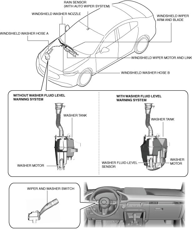 ― Windshield wiper/washer system― Auto wiper system (with auto wiper system)― Washer fluid level warning system (with washer fluid level warning system)