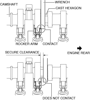 • Do not disassemble the electric variable valve timing actuator and hydraulic variable valve timing actuator because they are precision units.• If the camshaft is rotated with the timing chain removed and the piston at the top dead center position, the valve may contact the piston and the engine could be damaged. When rotating the camshaft with the timing chain removed, rotate it after lowering the piston from the top dead center position.• When rotating the camshaft using a wrench on the cast hexagon, the wrench may contact the rocker arm and damage the rocker arm. To prevent damage to the rocker arm when holding the camshaft on the cast hexagon, use a wrench on the rear side of the engine as shown in the figure to secure a clearance between the cam.