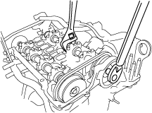 • The bolt contacts the tensioner arm when it is inserted approx. 20 mm {0.79 in}.• Hold the exhaust camshaft using a wrench on the cast hexagon and move it back and forth a few times as shown in the figure. This will drain the oil from the chain tensioner and make the following servicing easier.