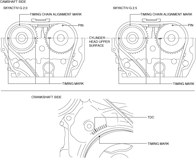 • The timing mark of SKYACTIV-G 2.5 is not parallel with the upper surface of the cylinder head.