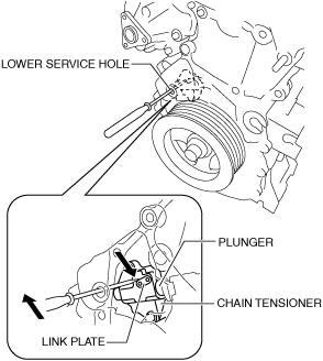 • Release the tension on the timing chain by securing the timing chain tensioner arm through the service hole on the engine front cover.