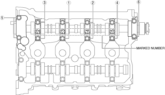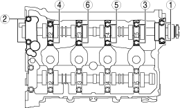 3.Loosen the exhaust-side camshaft cap bolts in two or three passes in the order shown in the figure, and remove the camshaft caps.