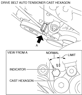 2.Verify that the indicator part of the cast hexagon on the drive belt auto tensioner is within the normal range.