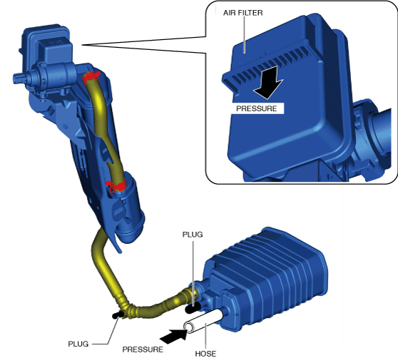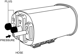 4.Apply pressure (19.6 kPa {147 mmHg, 5.79 inHg}) through the hose, and verify that air does not leak from the charcoal canister.