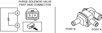 • If not as specified, replace the purge solenoid valve. (See PURGE SOLENOID VALVE REMOVAL/INSTALLATION [SKYACTIV-G (WITHOUT CYLINDER DEACTIVATION (US))].)