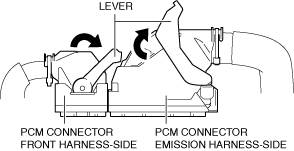 • Do not touch the PCM connector terminal. The terminal is extremely thin and can be damaged by touching it.• If the PCM connector is inserted at an angle and the lever is moved, the connector could be damaged. Verify that the PCM connector is inserted straight.